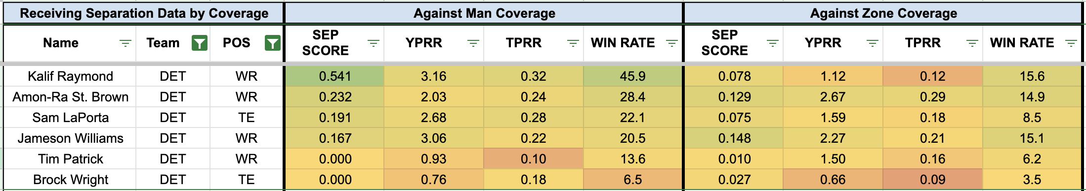 Kalif Raymond and Sam LaPorta lead the team in targets per route run against man coverage. Besides Raymond and LaPorta, Williams produced the second-best yards per route (2.81) yet the fourth-ranked Average Separation Score against man coverage on the Lions.