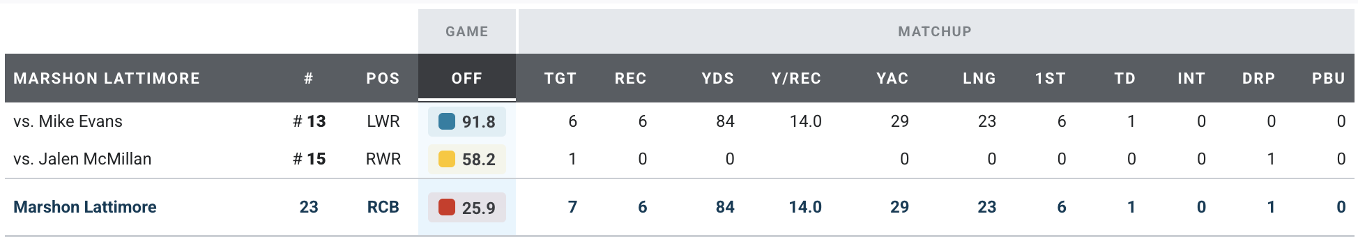 The data suggests Amon-Ra St. Brown and Jameson Williams have projected tougher matchups. However, Lattimore has struggled lately in 2024, especially against more skilled and athletic receivers. That's evident in Mike Evans winning and producing well against Lattimore in the Wild Card round.