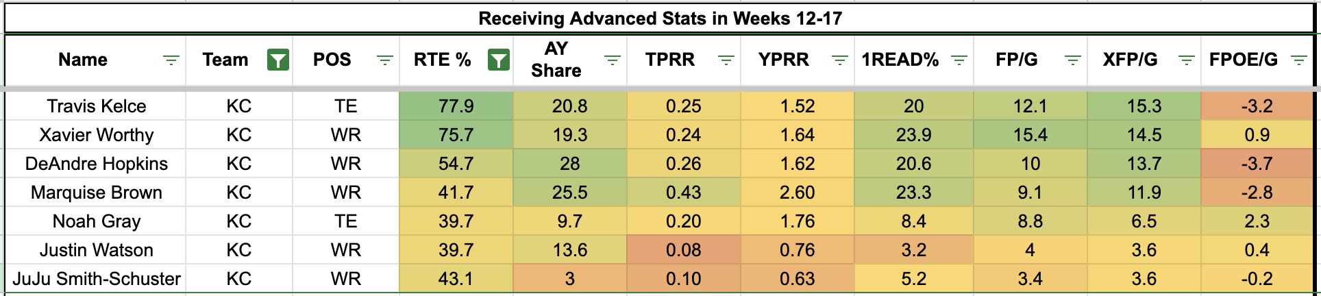 Though Brown ranked highly in the per-route data against single-high safety coverage, Worthy has been inefficient, with 1.53 yards per route with a 25 percent target rate. While it might not show up in the advanced numbers, the Chiefs have been creatively using Worthy, including 2-3 rush attempts in Weeks 15-17 paired with three consecutive games with career-high targets (11, 11, 9).
