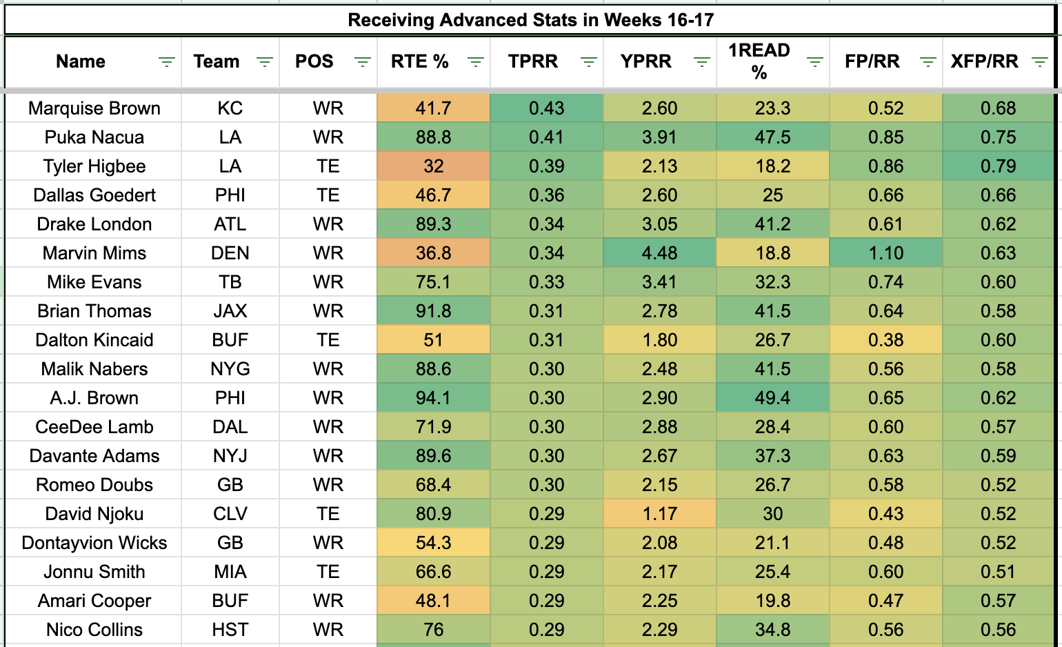 With Marquise Brown healthy, he primarily played in the slot on nearly half of his routes. Brown averaged 11.9 expected fantasy points per game (No. 52), behind Xavier Worthy at 19.3 (No. 8) and Travis Kelce with 16.6 (No. 18) in Weeks 16-17. We'll want to be cautious with the small samples, but Brown garnered an elite 43 percent target per route rate, ranking first in Weeks 16-17.