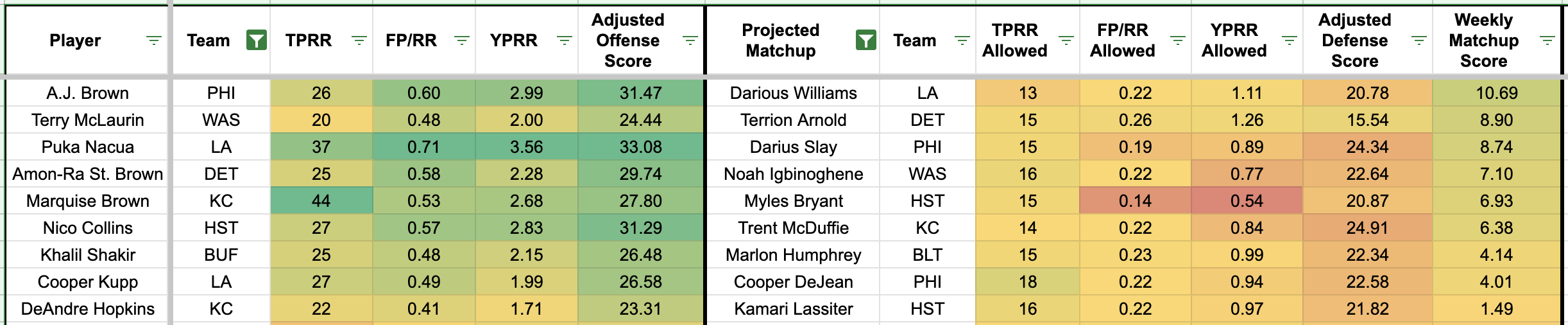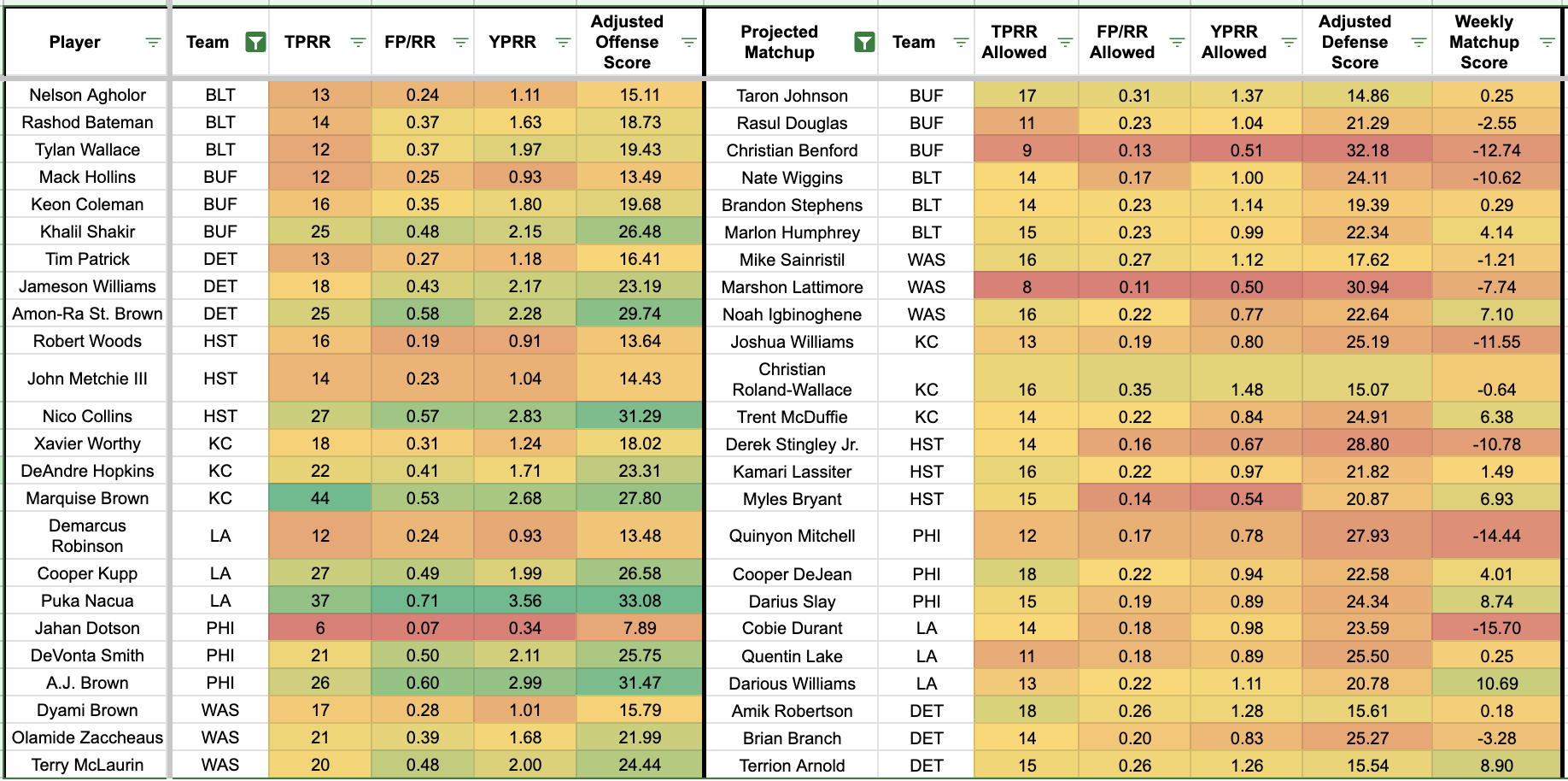 We'll have a weekly matchup score with those adjusted scores, which are calculated by subtracting the defensive from the offensive number. The caveat is that limited data due to injured offensive and defensive players could possibly skew the matchups to be more or less favorable. Since this is a newer process, there might be some slight tweaks along the way.