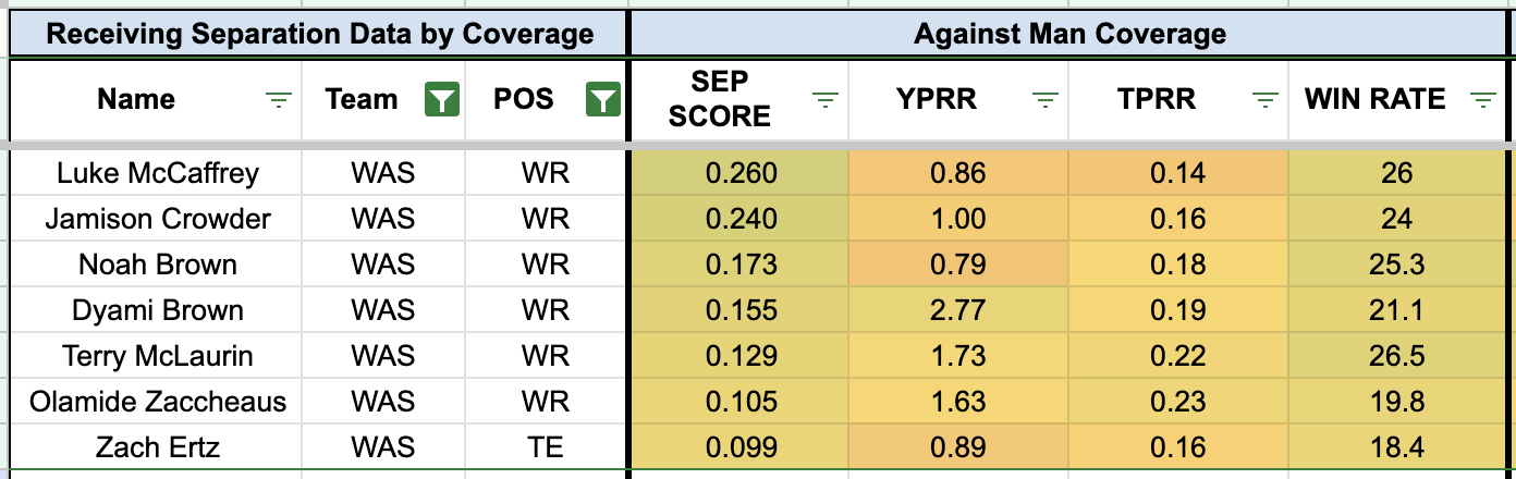 McLaurin ranks fifth on the Commanders in Average Separation Score against man coverage, behind Luke McCaffrey, Jamison Crowder, Dyami Brown, and Noah Brown. Given their third-highest tight coverage rate, the Lions tend to play press-man coverage. One way for the Commanders to challenge the Lions involves whether McLaurin and their receivers can win against man coverage.