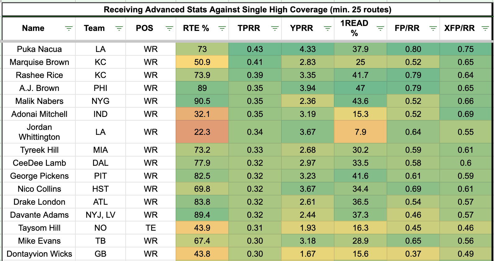 However, Brown leads the Chiefs with a 41 percent target rate against single-high safety looks, ahead of Rice (39 percent). That ranks Brown second behind Puka Nacua in target rate against single-high safety coverage, with Brown ranking 18th in yards per route run (2.83).
