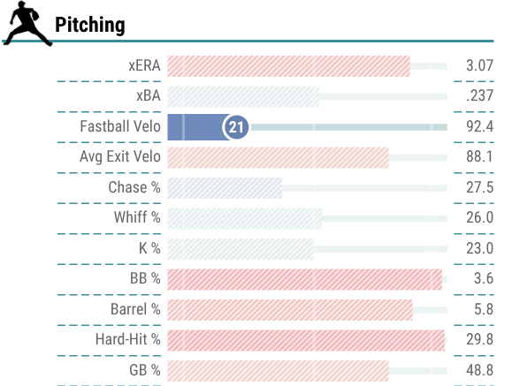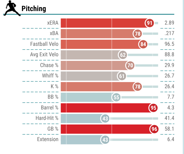 He derives his value from posting a low walk rate, which was just 5.2% in 2025, and ranked him in the 93rd percentile. So, he will not beat himself out there. Additionally, he does not allow a ton of hard contact, as his 88.3 mph average exit velocity allowed last season ranked him in the 75th percentile.