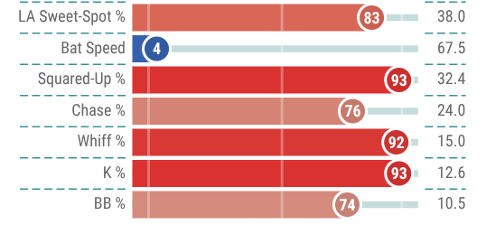 He ranked in the 70th percentile or better in xBA (.263), xSLG (.467), and LA Sweet-Spot rate (39.2). Additionally, he ranked in the 60th percentile or better in average exit velocity (90.7 mph) and barrel rate (10.4%).