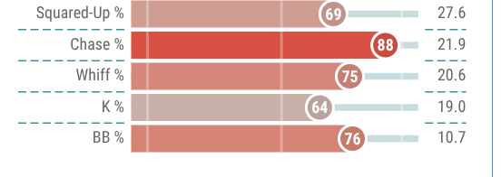 In 2025, he posted just a 12.6% K rate, 15% whiff rate, and 24% chase rate. This placed him in the 75th percentile or better in each metric, and he also ranked in the 74th percentile with a 10.5% walk rate.
