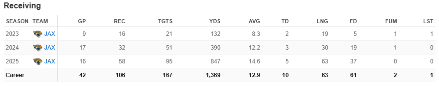 It wasn’t Jakobi Meyers, Travis Hunter, or Brian Thomas Jr., who led the way for the Jaguars in receptions, targets, and receiving yards; it was the overlooked Parker Washigton who became Trevor Lawrence's primary target. He hauled in 58 or 95 targets for 847 yards during the 2025 regular season. Then Washington continued his strong postseason play, securing a team-high seven catches for 107 yards in a 27-24 loss to the Bills in the AFC Wildcard round.