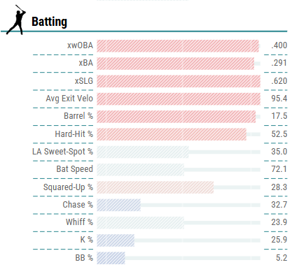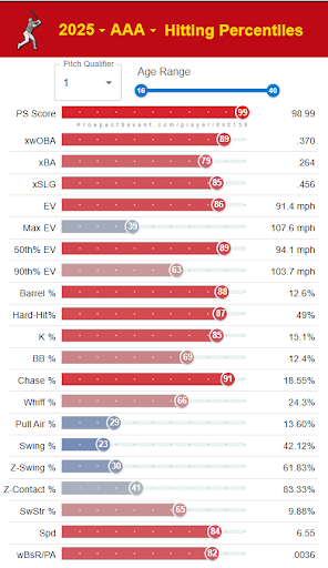 Sal Stewart is one of the safest prospects to draft in fantasy because he should play almost every day for the Reds. Stewart was another September call-up in 2025, and he wasted no time showcasing his power. In 58 plate appearances, he crushed five home runs with a .291 ISO. His Statcast profile highlights his ability to make hard contact.