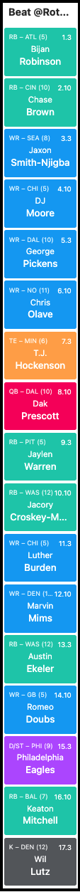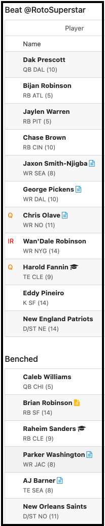 Among the many draft picks and waiver wire moves made, the main studs leading you to glory were Bijan Robinson, Chase Brown, Jaxon Smith-Njigba, George Pickens, Chris Olave, Dak Prescott and Wan'Dale Robinson. Kudos to you! Here was the original drafted roster, and the final roster: