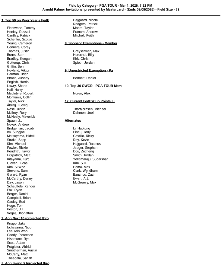 The Arnold Palmer Invitational is the third Signature Event of the season and features a 72-player field with a cut after 36 holes. It is one of the strongest fields we will see all year, highlighted by the top-10 players in the Official World Golf Ranking all teeing it up.