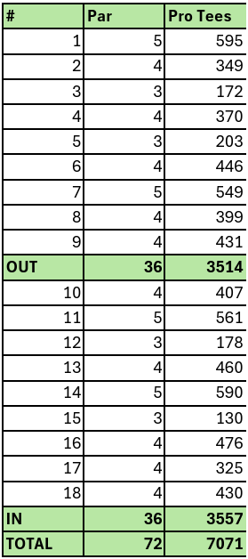 - Par: 72 (4x 3’s / 10x 4’s / 4x 5’s)