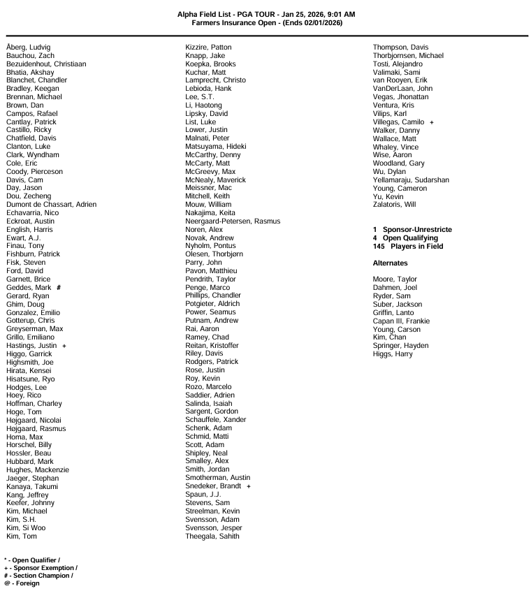 The PGA TOUR heads to La Jolla, California, this week for the Farmers Insurance Open, the second straight event held in the Golden State. It is also the second multi-course event of the season, with players rotating between the Torrey Pines North Course and South Course on Thursday and Friday. After the cut is made on Friday, all remaining players will compete over the weekend on the South Course at Torrey Pines.