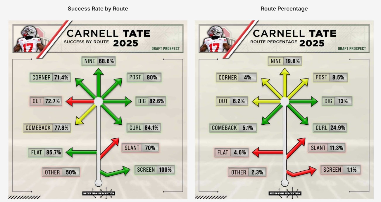 Carnell Tate, the polished and explosive wide receiver from Ohio State with reliable hands, crisp routes, and strong YAC ability, lands with the Washington Commanders in a young, ascending offense that’s ready for another weapon. Pairing him with Jayden Daniels and Terry McLaurin gives Tate a clear path to meaningful snaps and targets as a rookie, especially in a pass-friendly scheme that spreads the ball around.