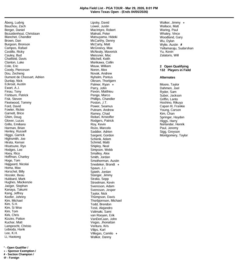 The PGA Tour travels to San Antonio, Texas, this week for the Valero Texas Open, the second of two stops in Texas leading into the first major of the season. The event takes place at TPC San Antonio (Oaks Course) and features a 132-player field with a cut after 36 holes.