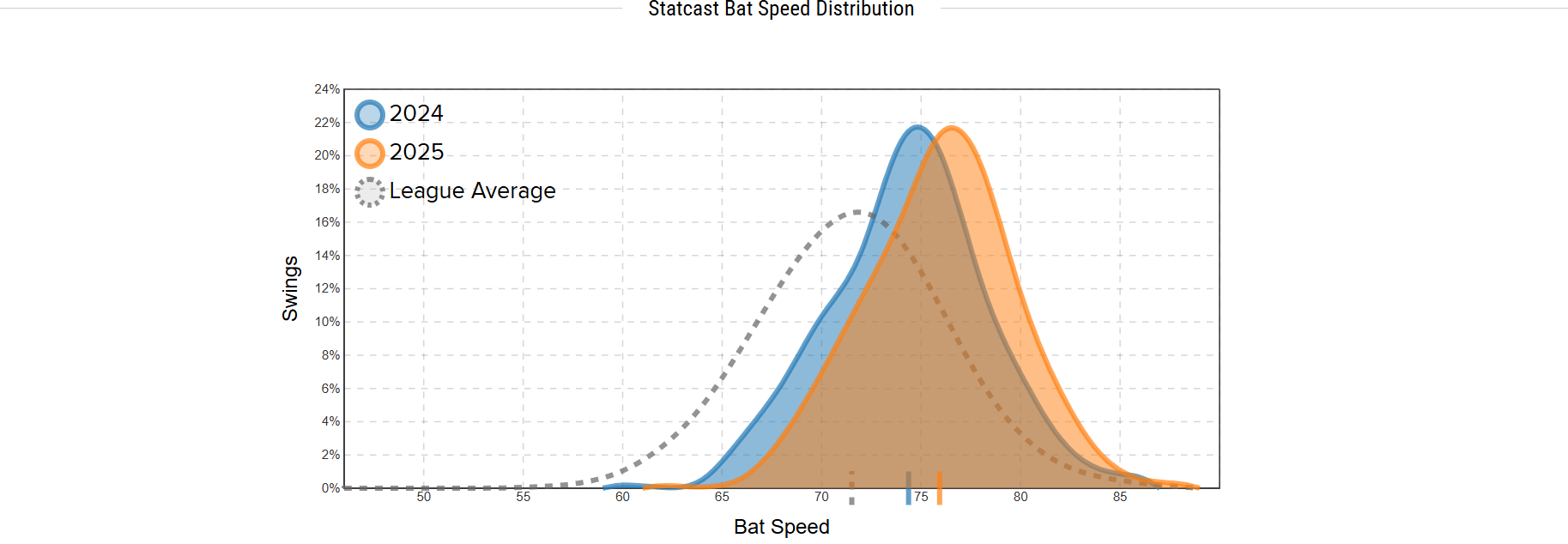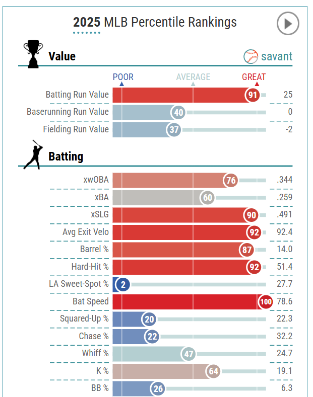 It feels like we have been waiting on the Goodman breakout for a long time, yet he is still only 26 years old. In 2024, he hit a lacklustre .190 with 13 home runs. In 2025, given a full-time job, he hit .278 with 31 home runs, 91 RBI, 73 runs scored, and chipped in a steal.