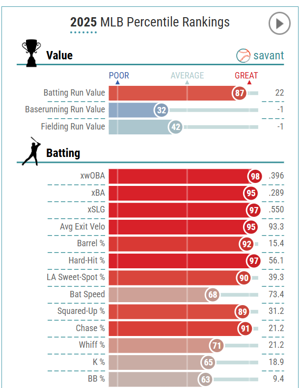 Caminero, who is 22 years old, had an incredible season and may be the best third baseman, at least offensively, in baseball right now. Many pundits predicted he would break out in 2025, and he did, hitting .264 with 45 home runs, 110 RBI, seven stolen bases, and 93 runs scored.