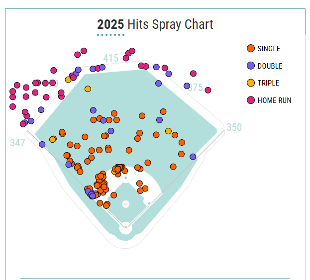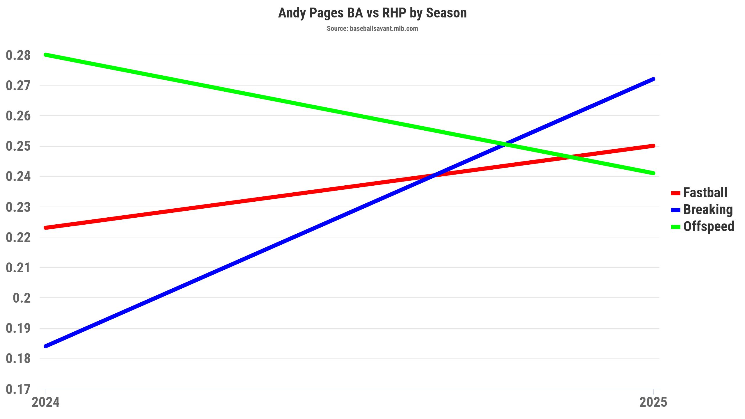 Take a look at the chart below. Much of the breakout was fueled by the gains Pages made against right-handed pitchers. He picked up more than 100 points of batting average in 2025 against breaking pitches from right-handed batters, and another 30 against fastballs.