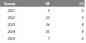 You can't steal first base, but Ford has hit in the minors. He hit .249/.377/.367 with seven homers in 523 PAs at Double-A in 2024, demonstrating an advanced plate approach (14.1 BB%, 22 K%, 10.5 SwStr%) and a footspeed-aided .323 BABIP. He lacked power despite a 41.3 FB% due to a 5.5% HR/FB, but he still graduated to Triple-A in 2025.