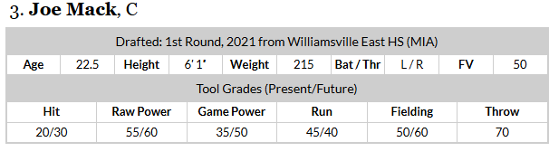 Mack is a 22-year-old former first-round pick with raw pop and plus defense, giving him a solid foundation to carve out a successful big league career. Scouts note that his "grooved, upper-cut swing" gives him "rare all-fields power for a catcher," while there's "still room for muscle on his frame".