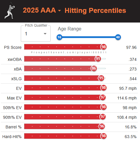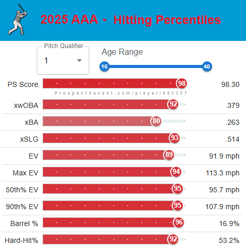 In particular, in 182 games at Triple-A between 2024 and 2025, the youngster slashed .303/.369/.466 with 23 home runs and a superb 16.0 percent strikeout rate and 9.1 percent walk rate.