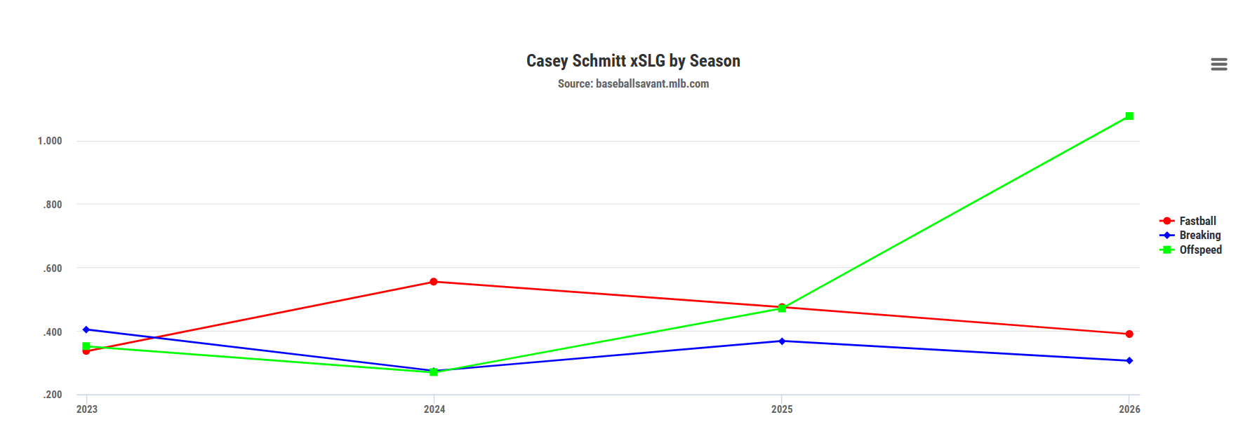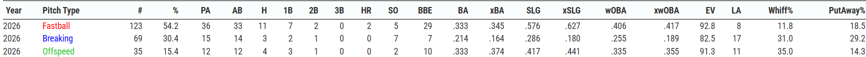 Vargas has generated an eye-catching 25.7% Pull AIR%, which is on pace to not only be the highest of his career, but is one of the highest marks among hitters this season. His low 37.1% ground-ball rate is a near 20-point drop from his 2025 mark and is on pace to be the lowest of his career.