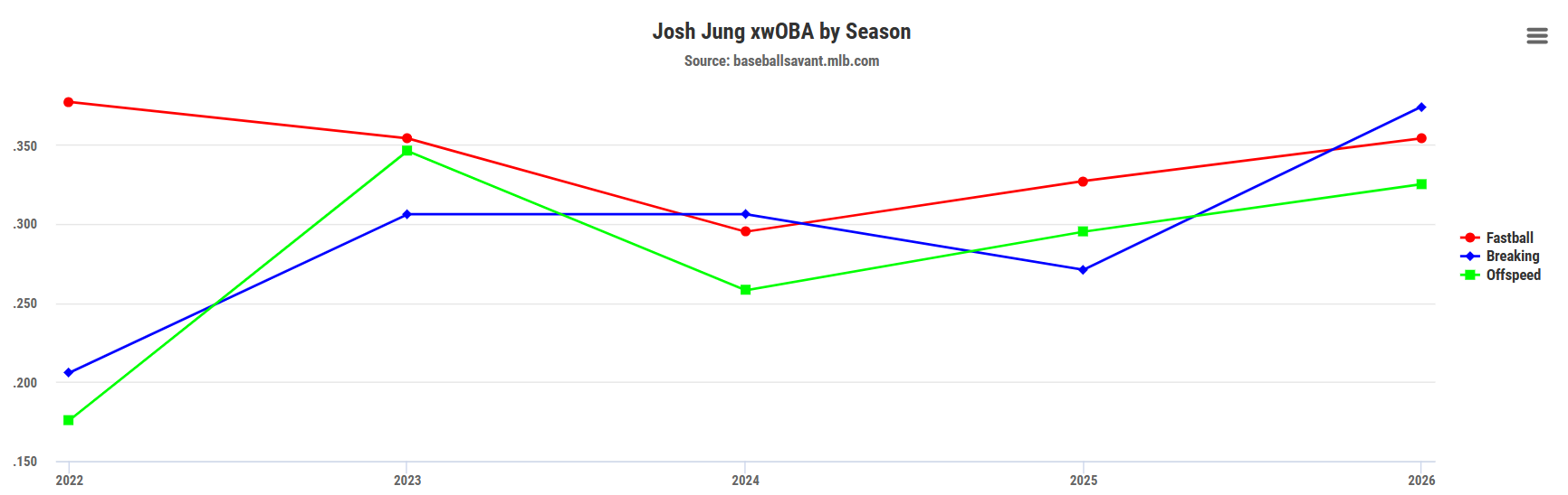 Looking deeper, Jung has had similar success against fastballs as he did last summer, but has greatly improved against breaking balls and offspeed pitches. So far, Jung has generated a strong .354 xwOBA against fastballs, only a slight jump from the .327 xwOBA he posted in 2025.