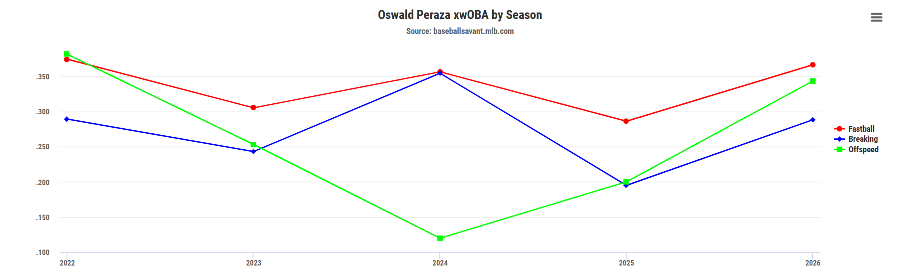 As a result, Peraza has not only found his footing but has begun to tap into the former prospect pedigree he flashed in the minor leagues. As shown below, Peraza has generated an elite xwOBA against fastballs and off-speed pitches, with a solid .288 xwOBA against breaking balls, a massive jump from his 2025 marks.