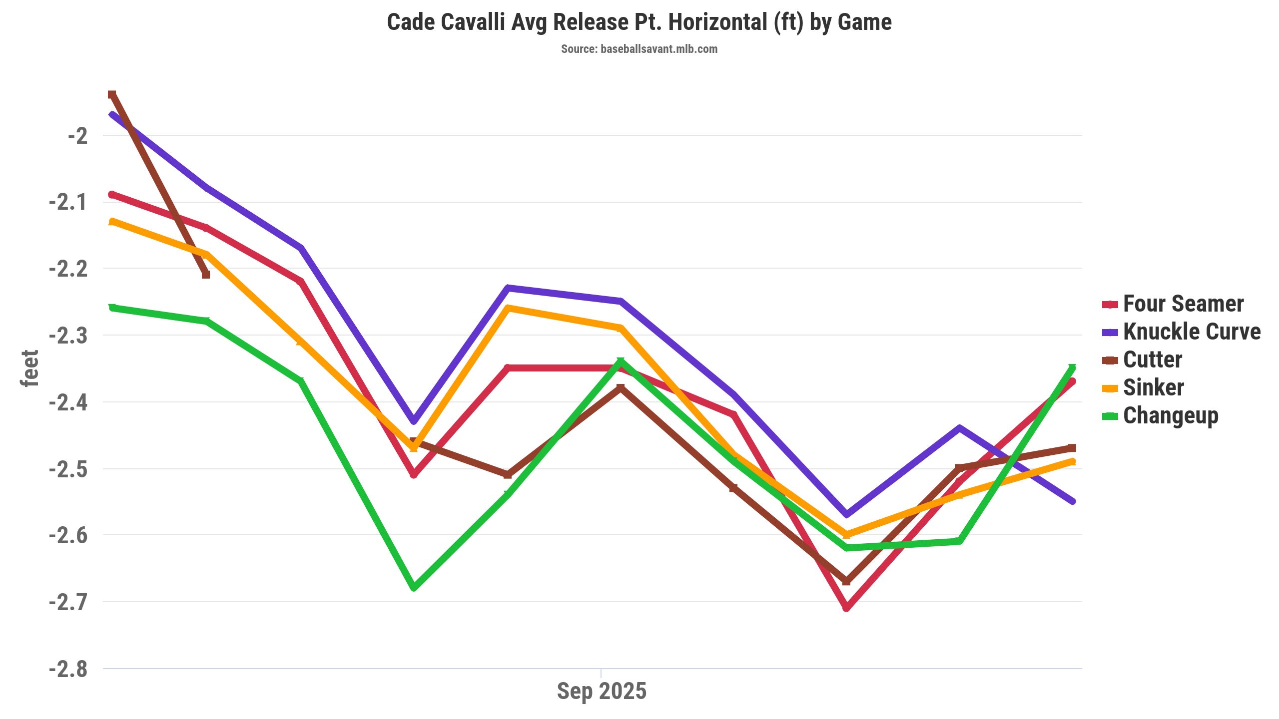 He was throwing from a higher arm angle (43.9 degrees), by over six degrees in 2025, primarily due to his horizontal release point shifting over five inches farther from his midline and adding nearly five inches (4.8) of extension. Interestingly, Cavalli's horizontal release point was almost six inches different (farther) at majors (28.3 inches) than what we saw in Triple-A (22.8 inches) in 2025.