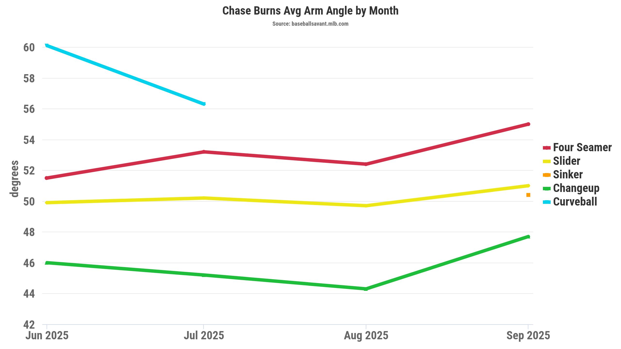 Burns throws from a higher arm angle, over 53 degrees, with over 18 inches of induced vertical break (IVB). For comparison sake, Burns, Lucas Giolito, Dylan Cease, Taj Bradley, Ryne Nelson, Landon Knack, Janson Junk, Nick Pivetta, Justin Verlander, and Tobias Myers throw from a 53-degree arm angle or higher, with over 18 inches of IVB on their four-seamer.