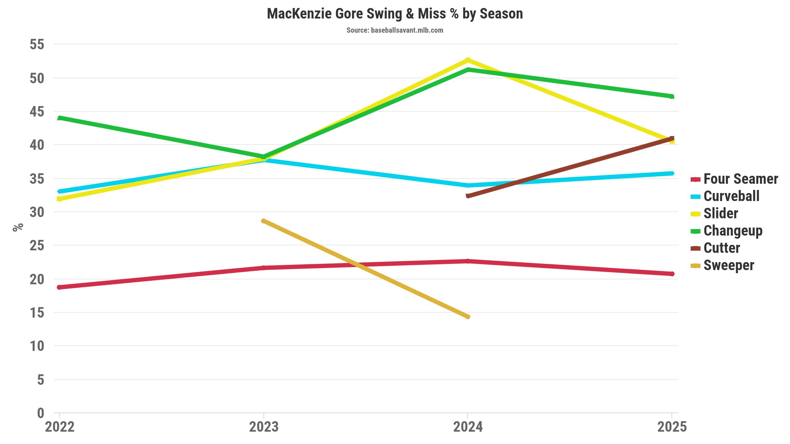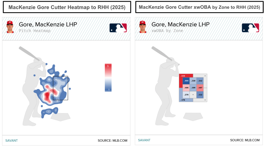 The data support the cutter heatmaps against right-handed hitters, with a 36.8 percent zone rate. It's an interesting wrinkle in Gore's arsenal, because before 2024, he threw the slider more often, though it could be a pitch classification issue. Over the past two seasons, Gore's cutter has elicited whiffs and induced weak contact.