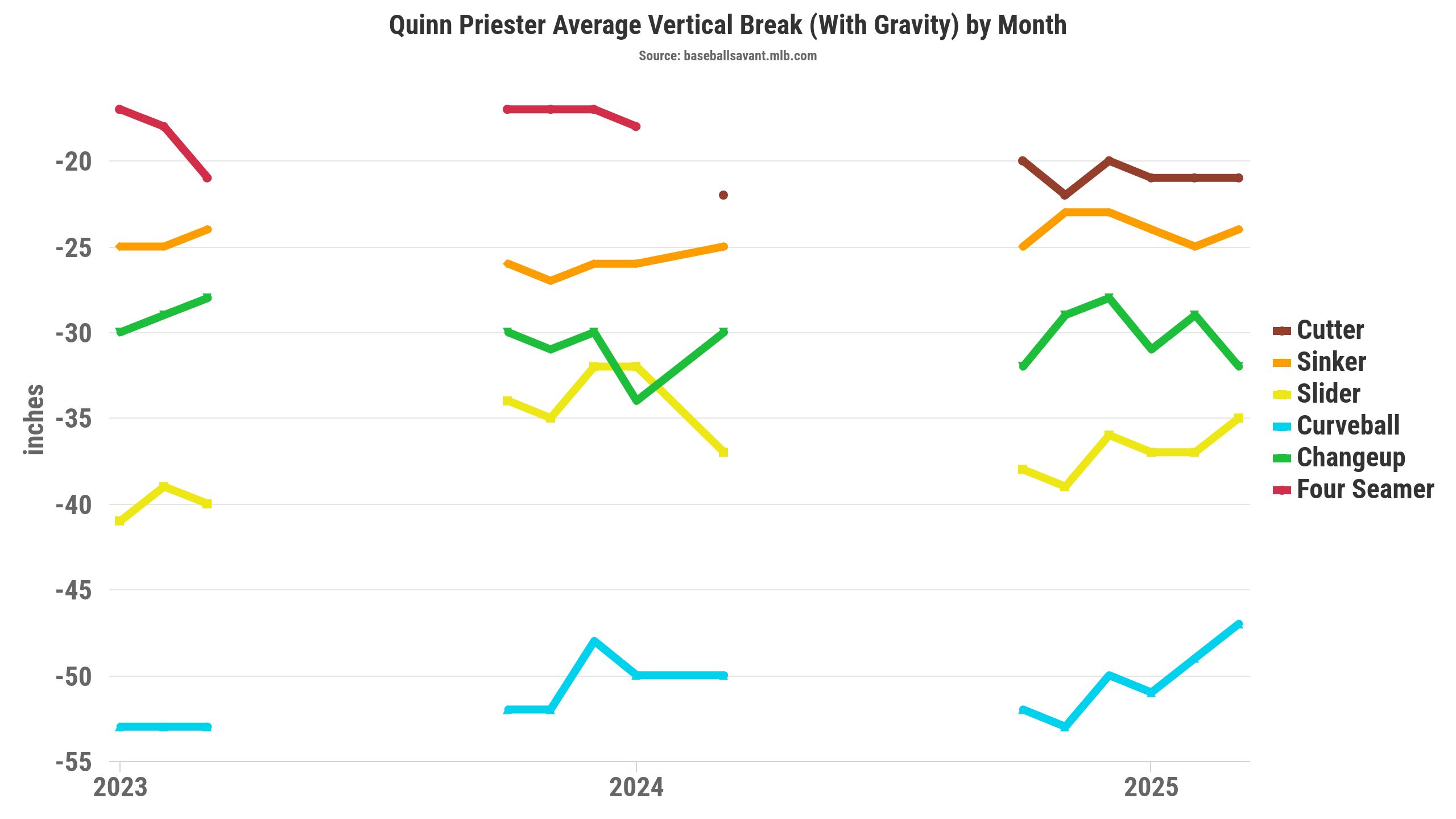 His slider added nearly four inches of downward movement while maintaining the glove-side sweep. Priester's slider movement profile change aligns with an improved swinging-strike rate at 17.1 percent (2025), compared to 12.4 percent (2024). Besides the slider, Priester's sinker lost over two inches of vertical movement, though it has been a weapon for groundballs and weak contact.