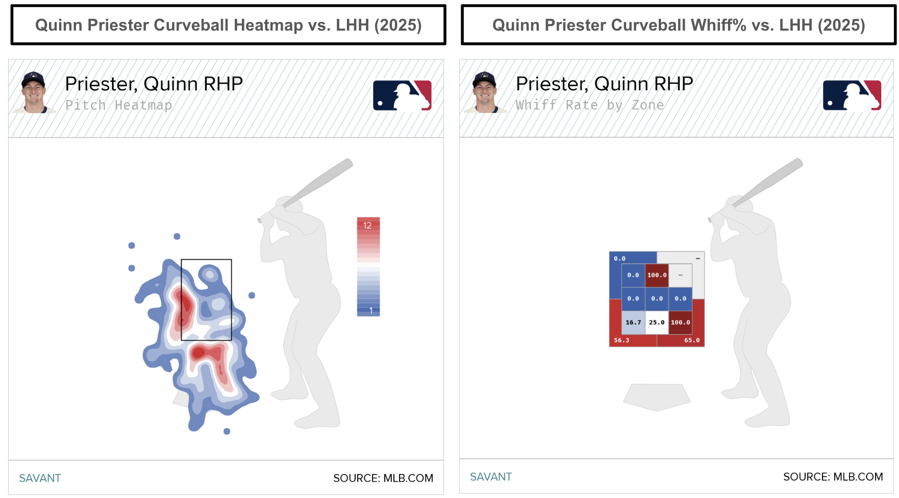 The sinker generates a 64.8 percent ground-ball rate while being slightly better against righties (.321 wOBA, .314 xwOBA) than lefties (.320 wOBA, .341 xwOBA). Interestingly, Priester's curveball led his arsenal with an 18.5 percent swinging-strike rate in 2025. Specifically, Priester's curveball has been deadly to left-handed hitters, allowing a .210 wOBA and a .230 xwOBA.