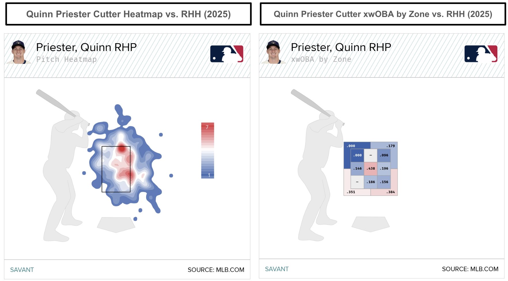 Since Priester lacks a dominant four-seamer, he added a cutter that he throws 24.1 percent of the time to left-handed hitters. Meanwhile, Priester throws the cutter 17.4 percent of the time, finding success (.241 wOBA, .234 xwOBA) against right-handed hitters. That's been a significant bump in cutter usage while locating the pitch away from righties.