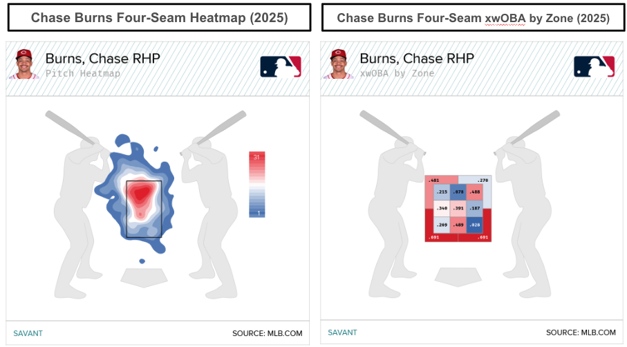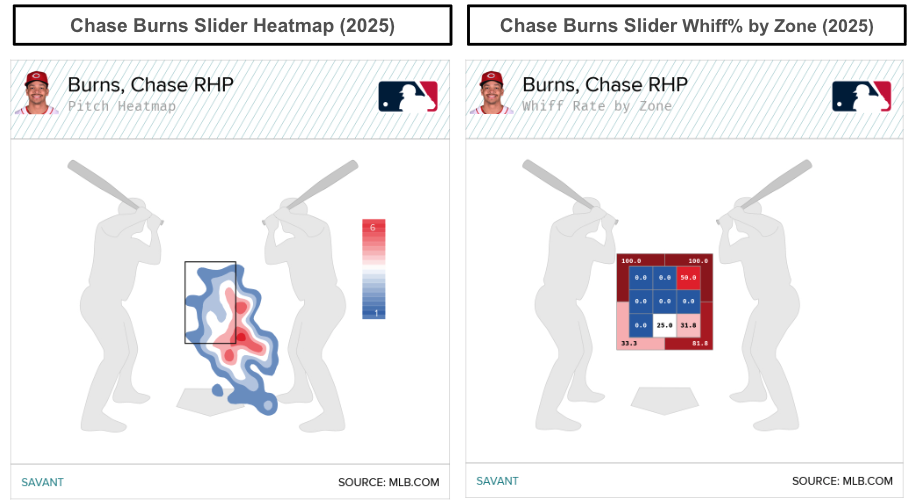 Before suggesting that Burns is another version of Hunter Greene, we would argue that Burns has better control and command than Greene, based on the heatmaps. Among the Reds' starting pitchers, Burns (106) trailed Nick Martinez (108) in Location+, aligning with the idea of Burns having good command and pitch location.
