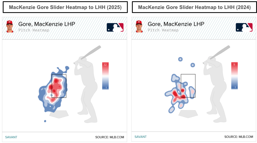 With Gore's pitch mix change, there has been a slight location change, as he throws more sliders to left-handed hitters. We've seen sliders thrown more up in the zone in 2025 than primarily down and away from left-handed hitters in 2024. The visual below shows Gore's slider heatmaps against lefties in 2024 and 2025.