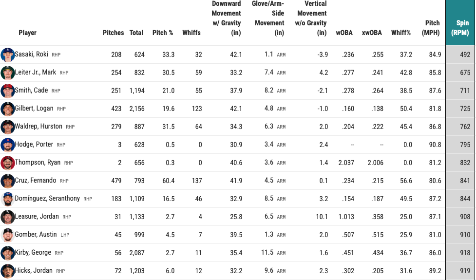 Waldrep's profile will be volatile, with poor control and a reliance on a splitter as his primary pitch. It's a unique splitter that comes from his higher arm angle (55.5 degrees), generating over 34 inches of downward movement. Waldrep's splitter is almost like a knuckleball, with the fifth-lowest spin rate, close to Logan Gilbert's splitter (min. 500 total pitches thrown). Gilbert's splitter is slower and drops nearly eight inches more than Waldrep's.