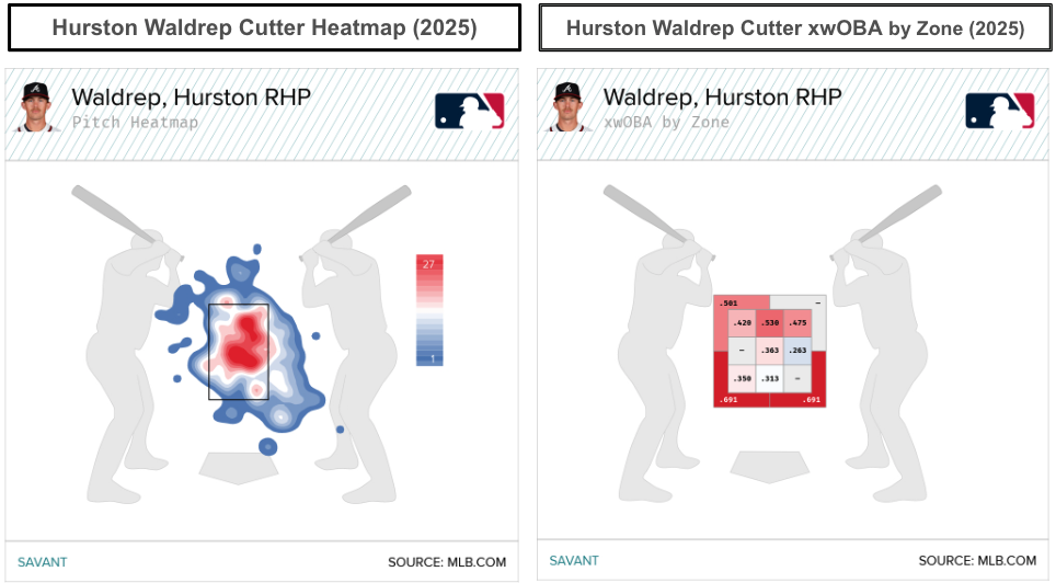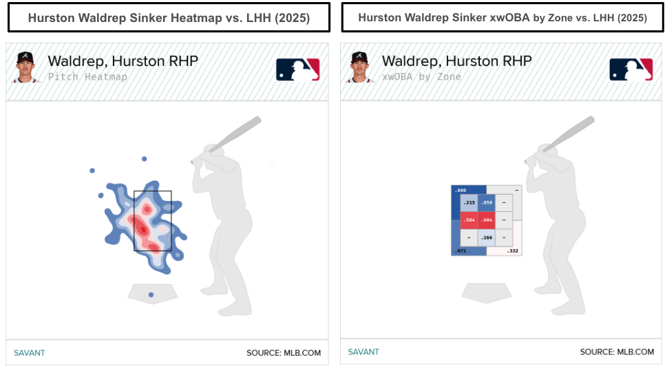 One adjustment for Waldrep's cutter in 2026 involves throwing it more toward the glove side of the plate, away from right-handers and toward the inside of the plate for left-handed hitters. Though cutters and sinkers don't typically raise excitement, let's talk about Waldrep's sinker. He locates it low and away from left-handed hitters, which can be an optimal approach.