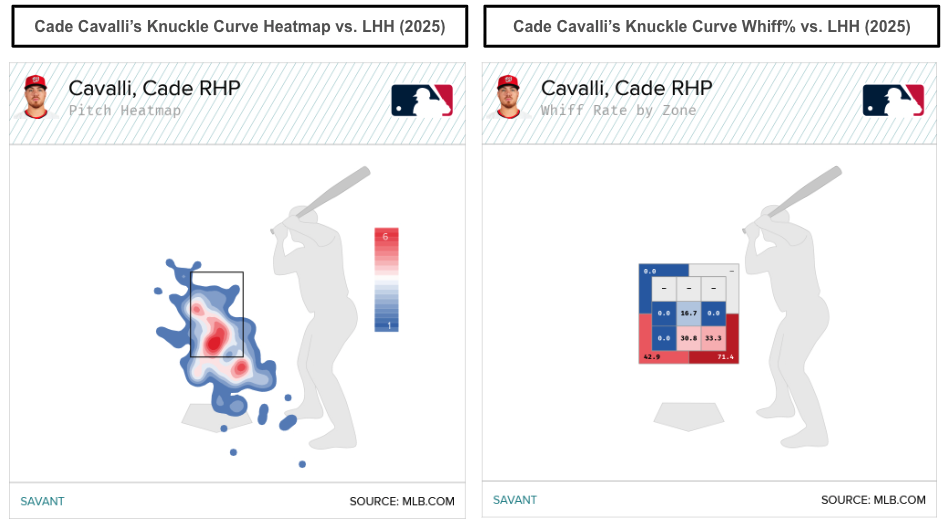 Cavalli's knuckle curve is a groundball machine, inducing a 68.4 percent groundball rate with above-average downward movement (50 inches). The additional extension helps to make his curveball a nasty offering that limits hard contact to left-handed hitters (.275 wOBA, .204 xwOBA) when he pounds it low in the zone. When Cavalli buries the knuckle curve low and below the zone, left-handed hitters chase and whiff.