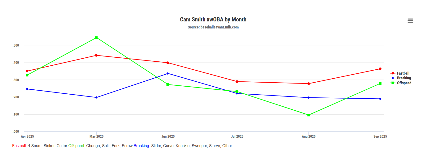 As shown in the chart above, Smith's underlying xwOBA against all three pitch types was quite high in the first half but declined sharply in July and August. However, in September, Smith raised his xwOBA against fastballs to .363, the third-highest mark in a given month. Additionally, he began to find his footing against offspeed pitches, posting a .278 xwOBA, also the third-highest mark in a given month.