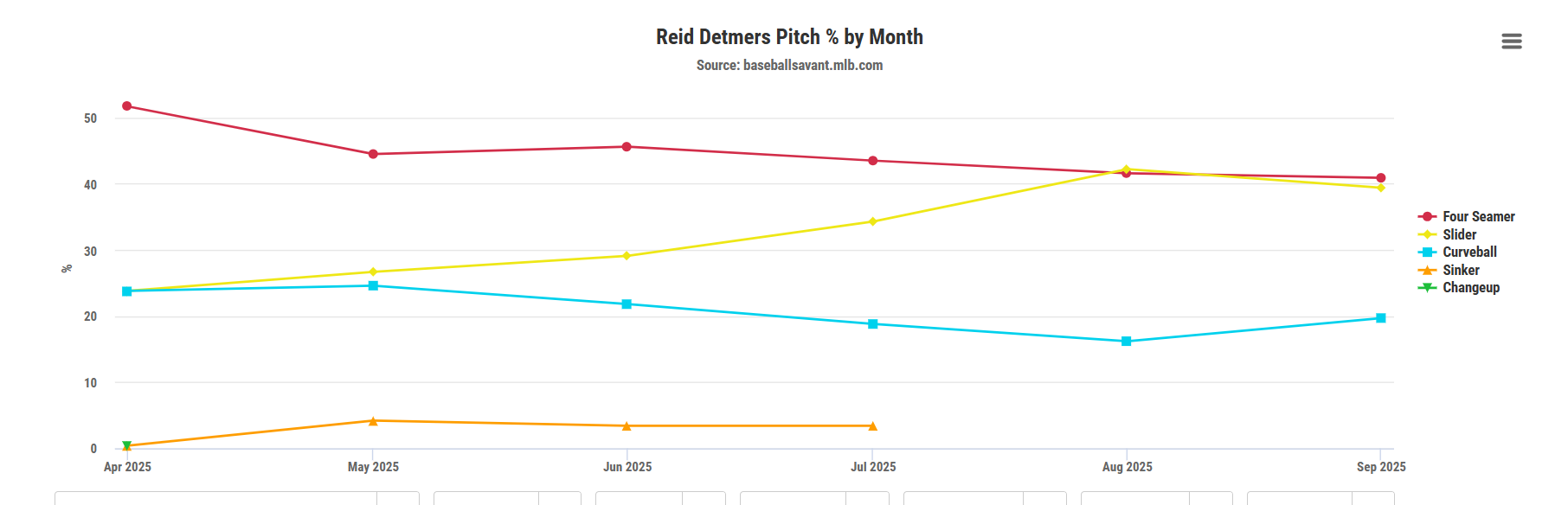 The prominent tweak Detmers made to his repertoire down the stretch was to increase his slider usage and completely drop his sinker, as shown below.