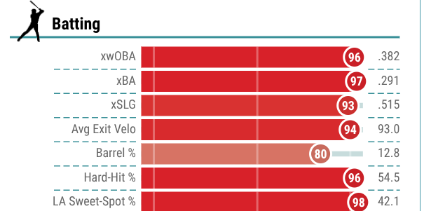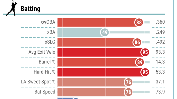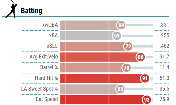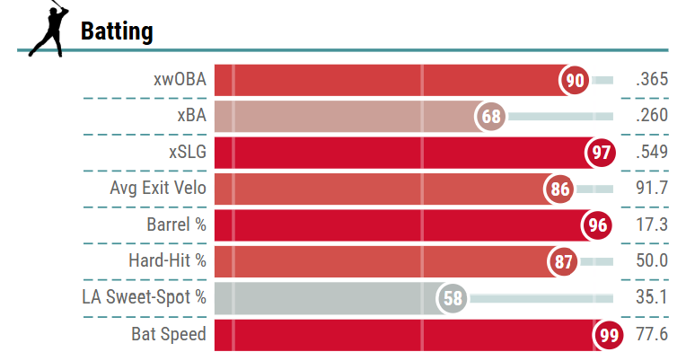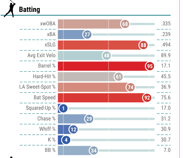 He ranked in the 85th percentile or better in several power categories, but most notably ranked in the 95th percentile in both hard hit rate (53.3%) and average exit velocity (93.3 mph). And while you may look at Olson and think his bat is slowing down, that is not the case, as he still ranked in the 76th percentile last season in terms of bat speed.