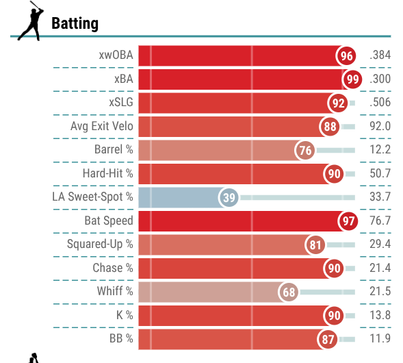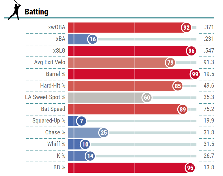 Overall, he ranked in the 85th percentile or better in xwOBA, xSLG, barrel rate, hard hit rate, bat speed, and walk rate. He will be a stalwart in your lineup this season, so be sure to grab him at his current ADP of 17 as he should greatly outperform that cost.