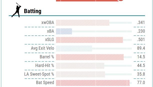 Last season, he smacked 21 HRs, 55 RBI, and 25 BB across just 284 plate appearances. It was a spectacular start for the youngster. While he did not qualify based on Statcast metrics, he posted a superb 14.5% barrel rate, .501 xSLG, .341 xwOBA, and 77 mph bat speed.