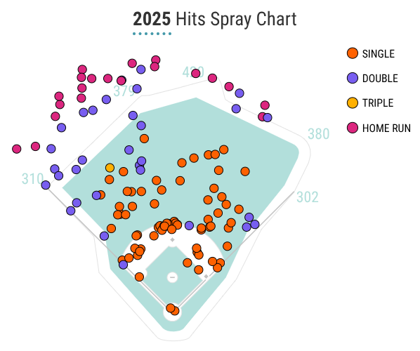 In 2025, Adell ranked in the 85th percentile or better in terms of xwOBA, xSLG, exit velocity, barrel rate, hard-hit rate, and bat speed. All of that equated to him mashing 37 home runs and driving in 98 runs. I would be more skeptical if I could, but the raw power was backed by the metrics.