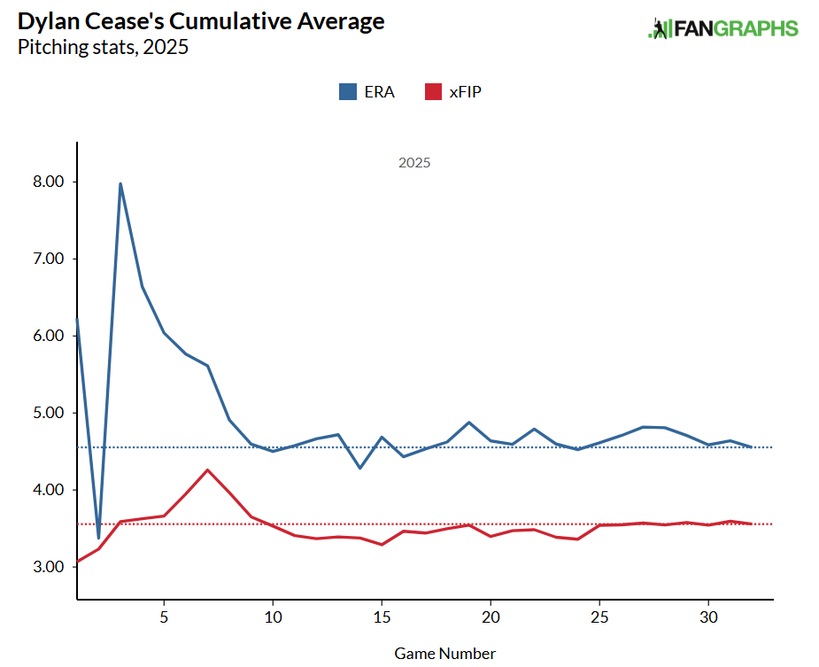 In 2024, Cease had a 3.47 ERA, 3.44 xFIP, and 3.46 SIERA. His ERA almost matched what we would expect it to have been. Last year, Cease had a 3.56 xFIP and 3.58 SIERA. Both being considerably better than his ERA highlights just how unlucky Cease was in 2025.