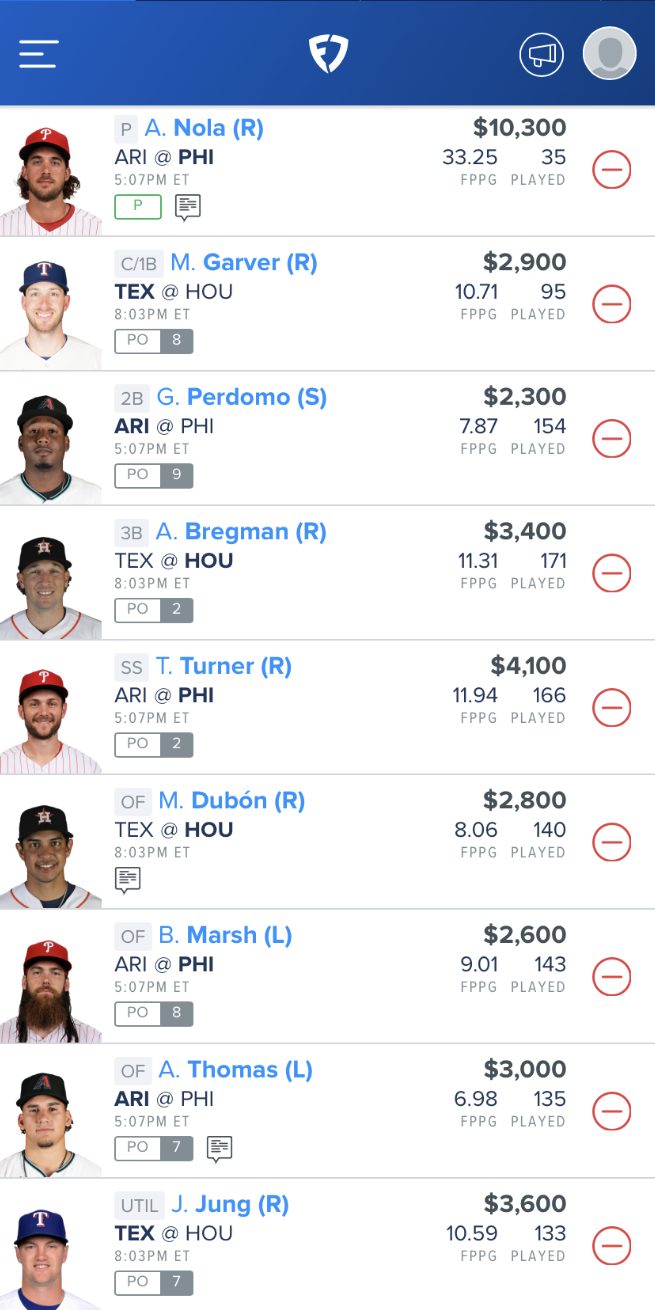 Please note that these are sample lineups designed only to show how you might use the above picks in your lineup. You should always check the weather and lineups before they lock to ensure your chosen players are playing tonight.