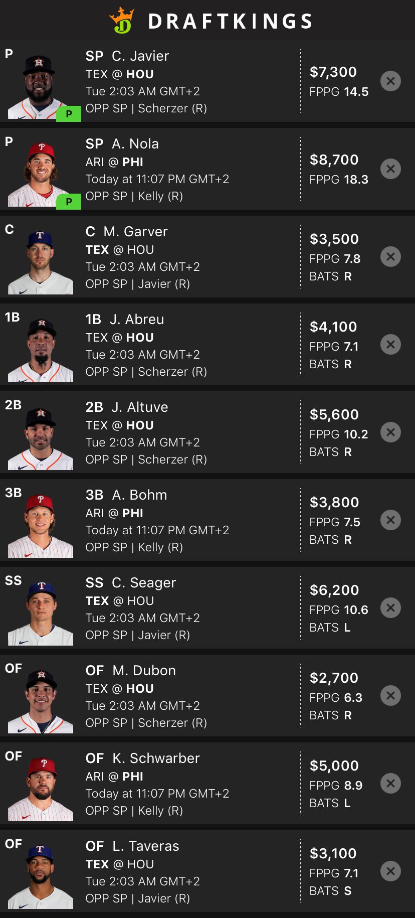 A 39-year-old pitcher who's thrown 63 competitive pitches since September 13 is not someone we should trust in our DFS lineups. Max Scherzer started Game 3 of the ALCS and was thoroughly battered by the Houston hitters for five earned runs across four innings. While his cheap price on FanDuel makes him a little more tempting, the safety and upside of Aaron Nola or Cristian Javier means we can leave Scherzer on the sidelines.