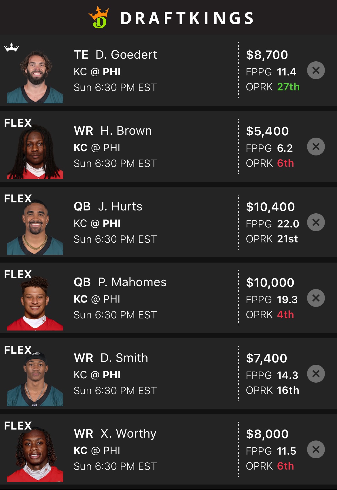 Even though I am playing the angle of the Eagles winning this game, we certainly want to get some KC pieces and if you are building multiple lineups, you are going to want to make some builds that are heavier with KC players, too.