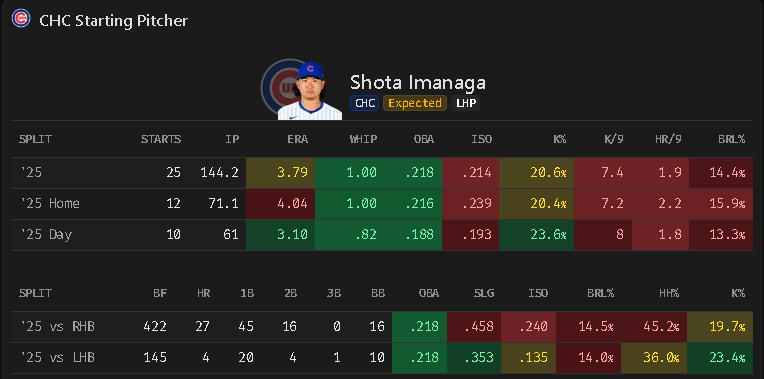 Imanaga has been hammered by RHP this season, giving up 27 of 31 home runs to RHB. September has been by far his worst month, too; he has given up 10 home runs and is giving up a wOBA of .380 to hitters. He has an HR/9 to RHB of 2.22, the highest on the slate.