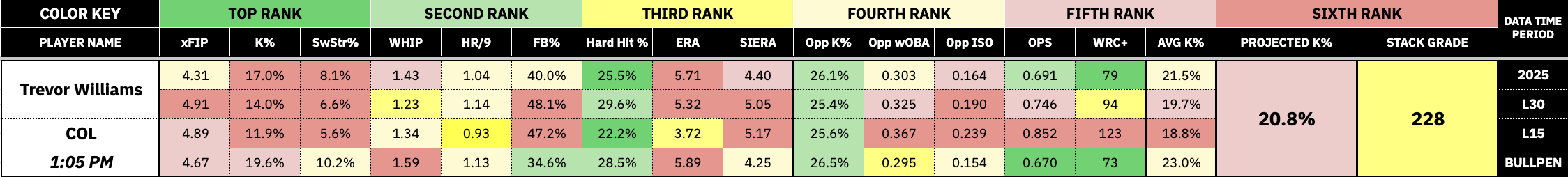 Williams has struggled in 2025 to a 4.31 xFIP, 8.1% SwStr, 1.43 WHIP, and a 1.04 HR/9. He has 1.14 HR/9 and a 48.1% FB over his last 30. The Rockies have been red hot, so there are plenty of options to choose from, but Mickey Moniak profiles the best for me.
